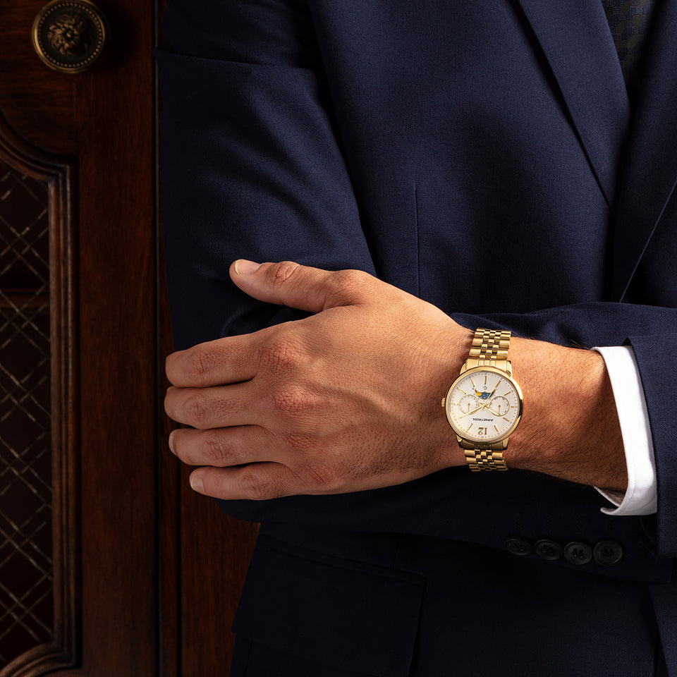 This sliding portrait bridges two moments in time. On the left is our founder, Mr. Eugen Gluck, wearing the watch he loved. On the right is the modern reissue created to celebrate Armitron’s fiftieth year.