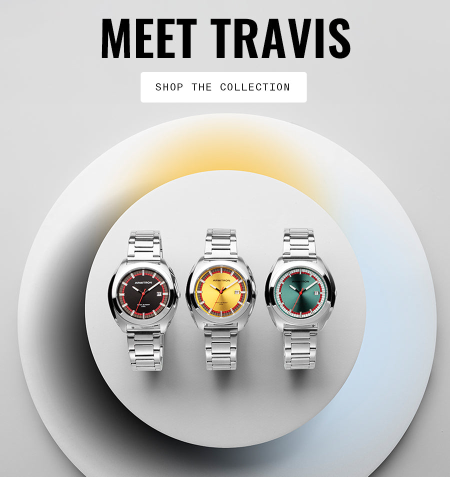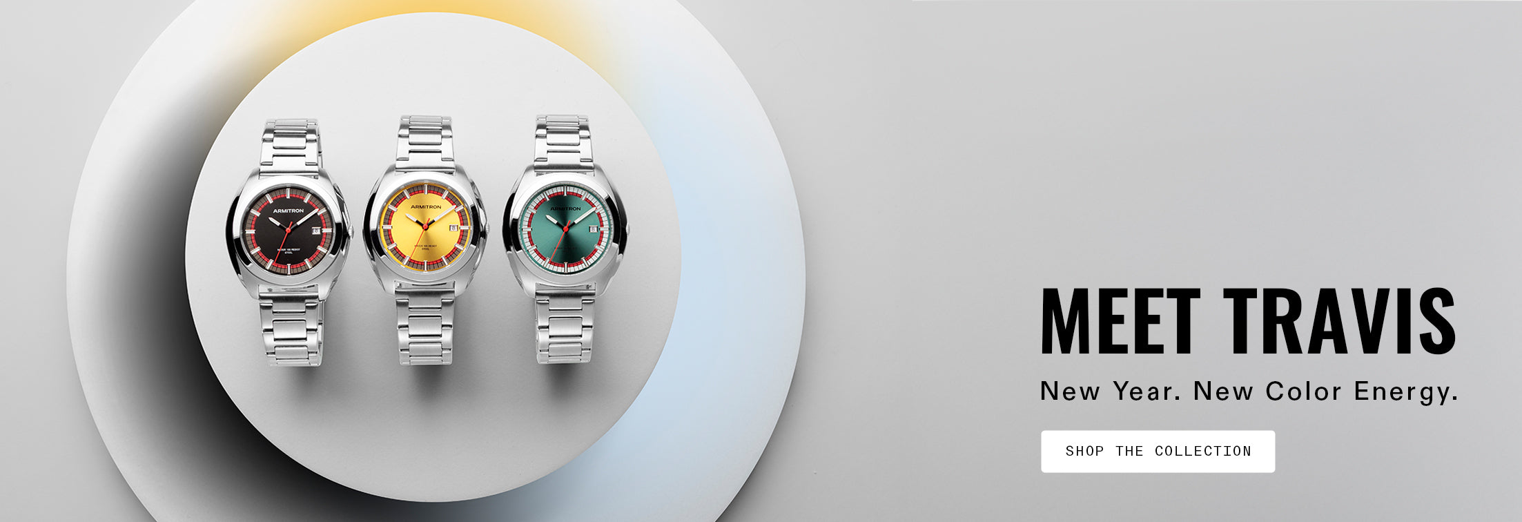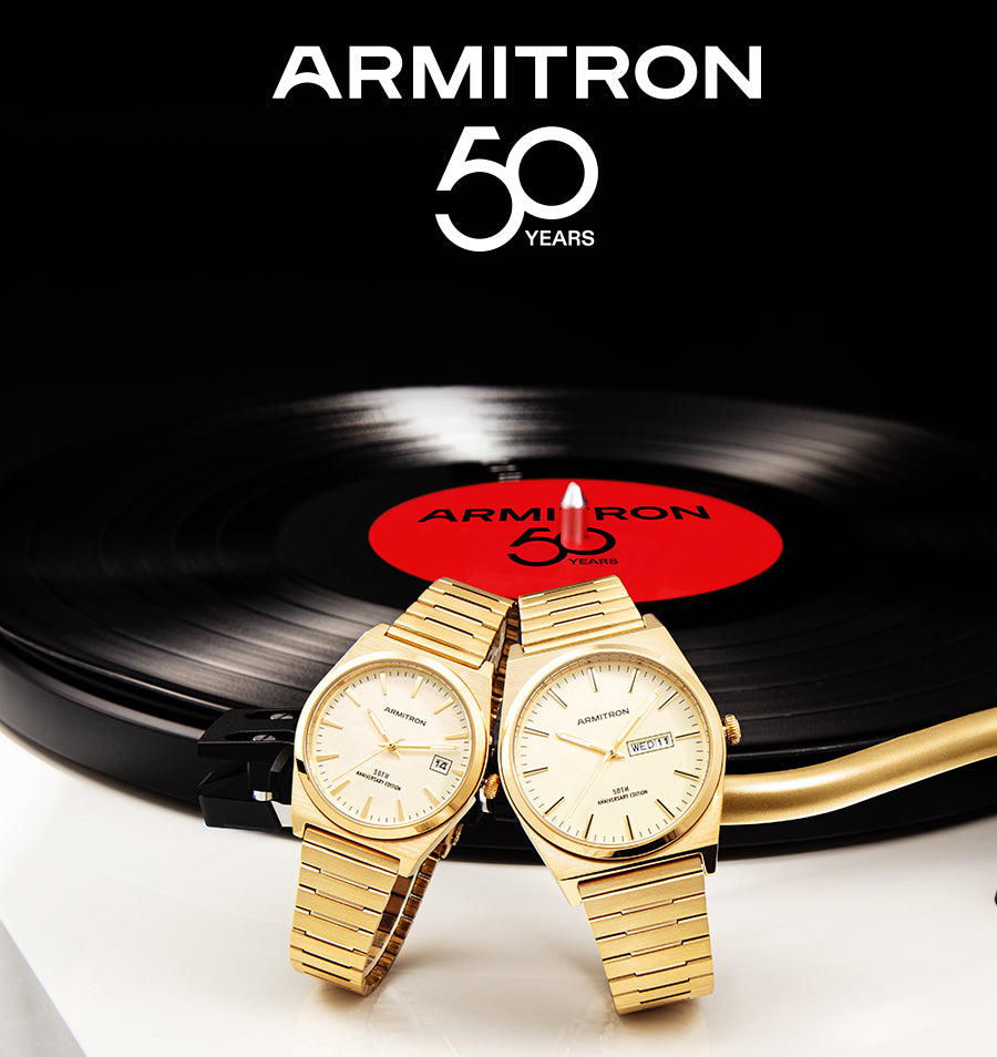 Dressed in his signature shades and red tee, Joe Cool leans into the moment on a dial split between racing stripes and bold color blocking—complete with a graphic “50” that nods to Armitron’s five decades of watchmaking.