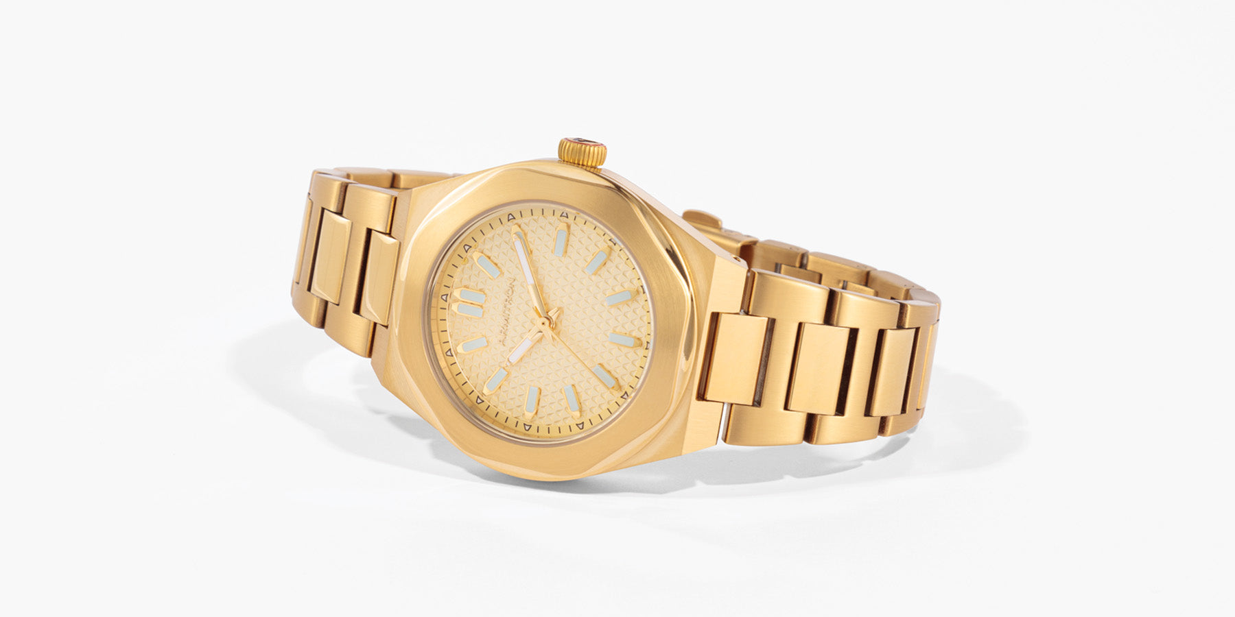 40mm, Gold - Limited EditionRegular Price $95The 1975 limited edition gold watch, is a modern reimagining of our original iconic Gold watch, created exclusively for our 50th Anniversary. Its champagne brushed dial features commemorative 50th Anniversary markings, blending heritage with a fresh perspective. A refined stainless steel case and uni-link bracelet with exposed center links bring contemporary elegance to this timeless design. With a day-date calendar and updated craftsmanship, this limited-edition piece honors the past while celebrating the present. -
